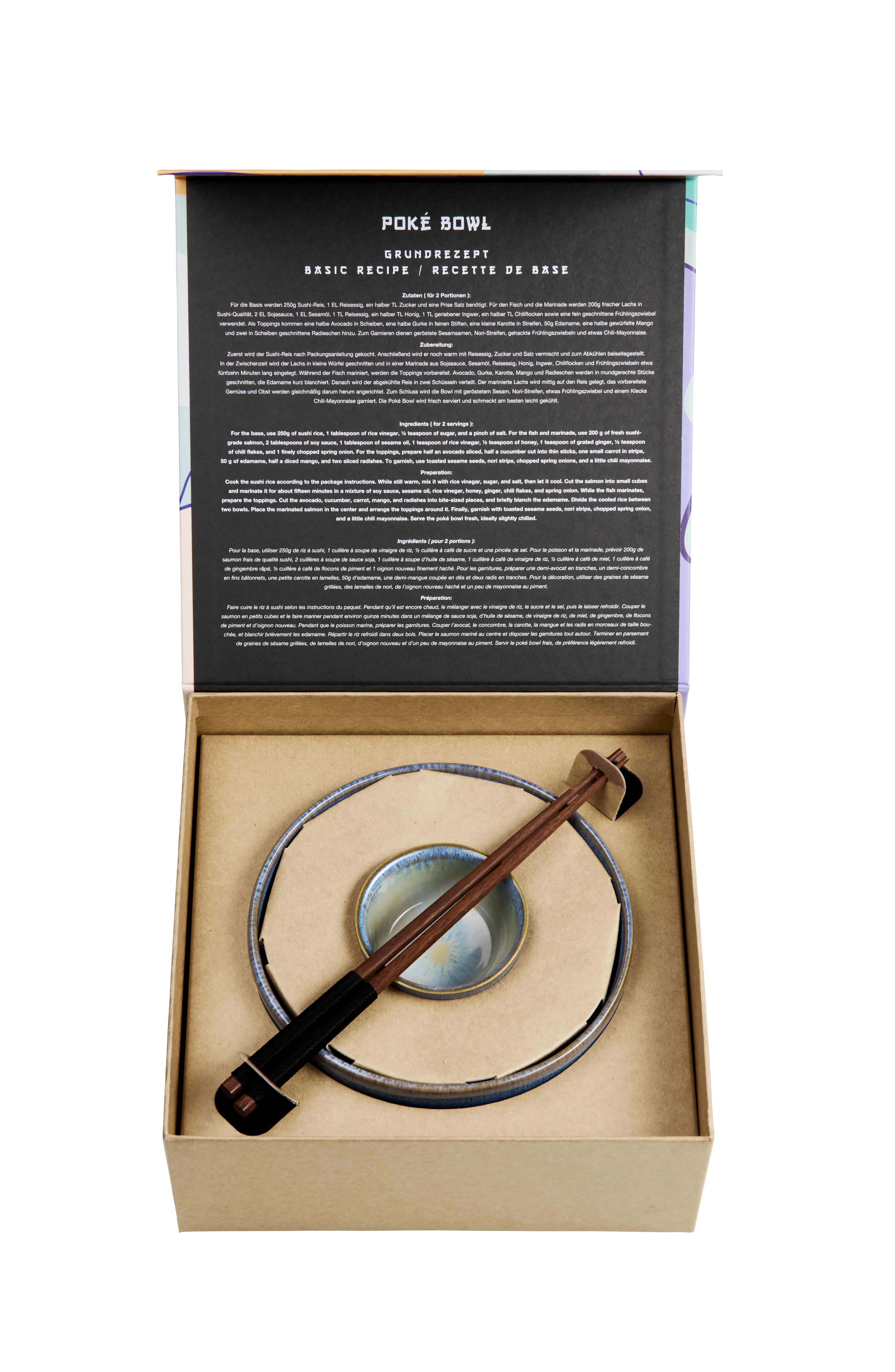 ASA Poké Bowl Geschenkset Tamari. Poké steht für echte Handarbeit. Es handelt sich um gefertigte Unikate aus Portugal. Die verschiedenen Glasuren reagieren bei jedem Brand unterschiedlich, so dass kein Teil dem anderen gleicht. Das Set besteht aus einer Bowl, einem kleinen Schälchen und Stäbchen.