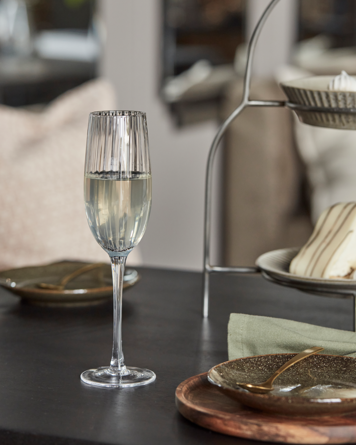 Dieses klassische Champagnerglas von House Doctor lädt zu geselligen Stunden ein. Das geriffelte Design ist ein dezentes Detail, das gut auf jeden Tisch und zu jedem Anlass passt und das Design ist gleichzeitig zeitlos und strahlt Klasse aus. Gönn dir in diesem Glas das gelegentliche ich-verdiene-es Glas Champagner oder verwöhne deine Gäste damit zu festlichen Anlässen