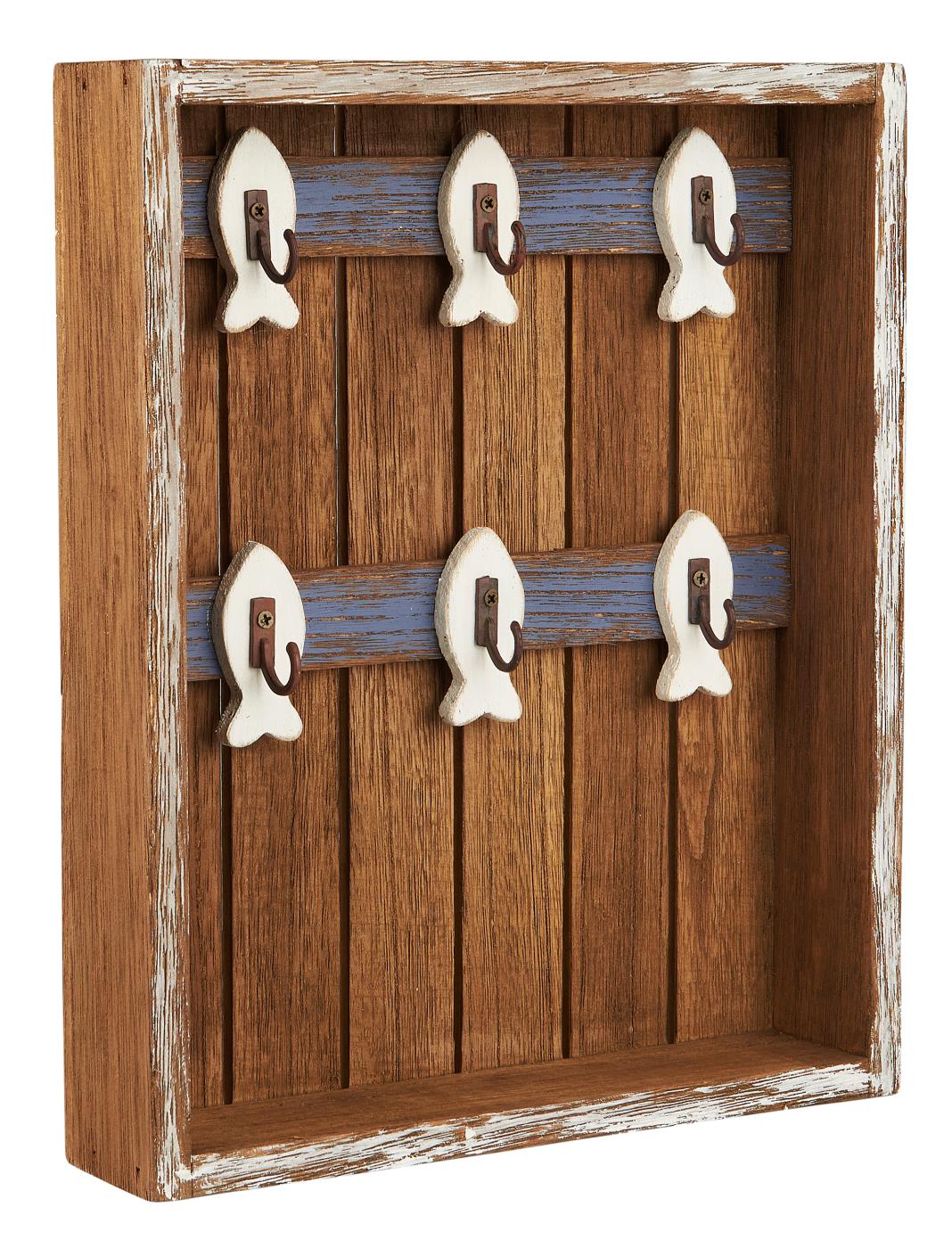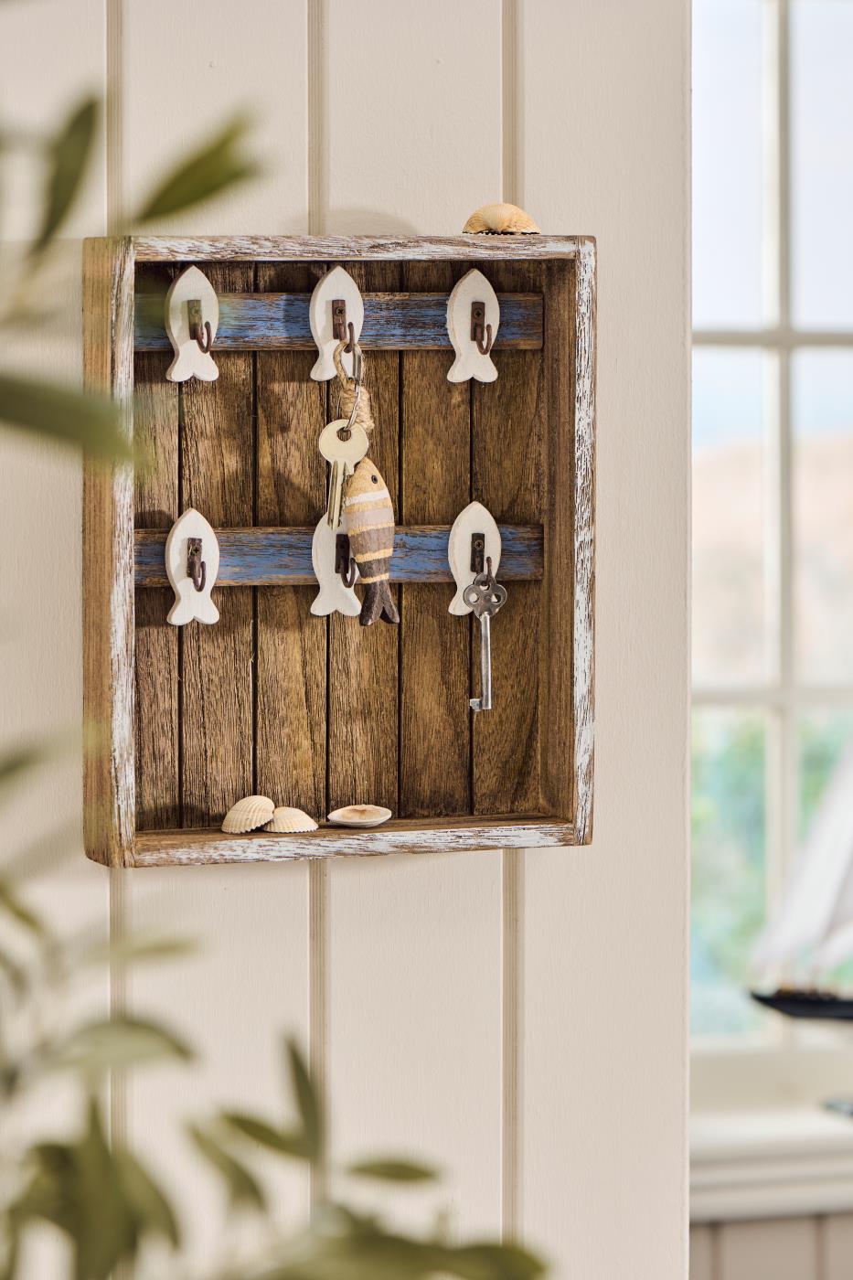 Ein Schlüsselschrank mit maritimem Charme. Der offene Holzrahmen mit kleinen Fischdetails bringt Küstenflair in Dein Zuhause. Eine praktische und dekorative Lösung zur Aufbewahrung von Schlüsseln im Flur oder im Ferienhaus.