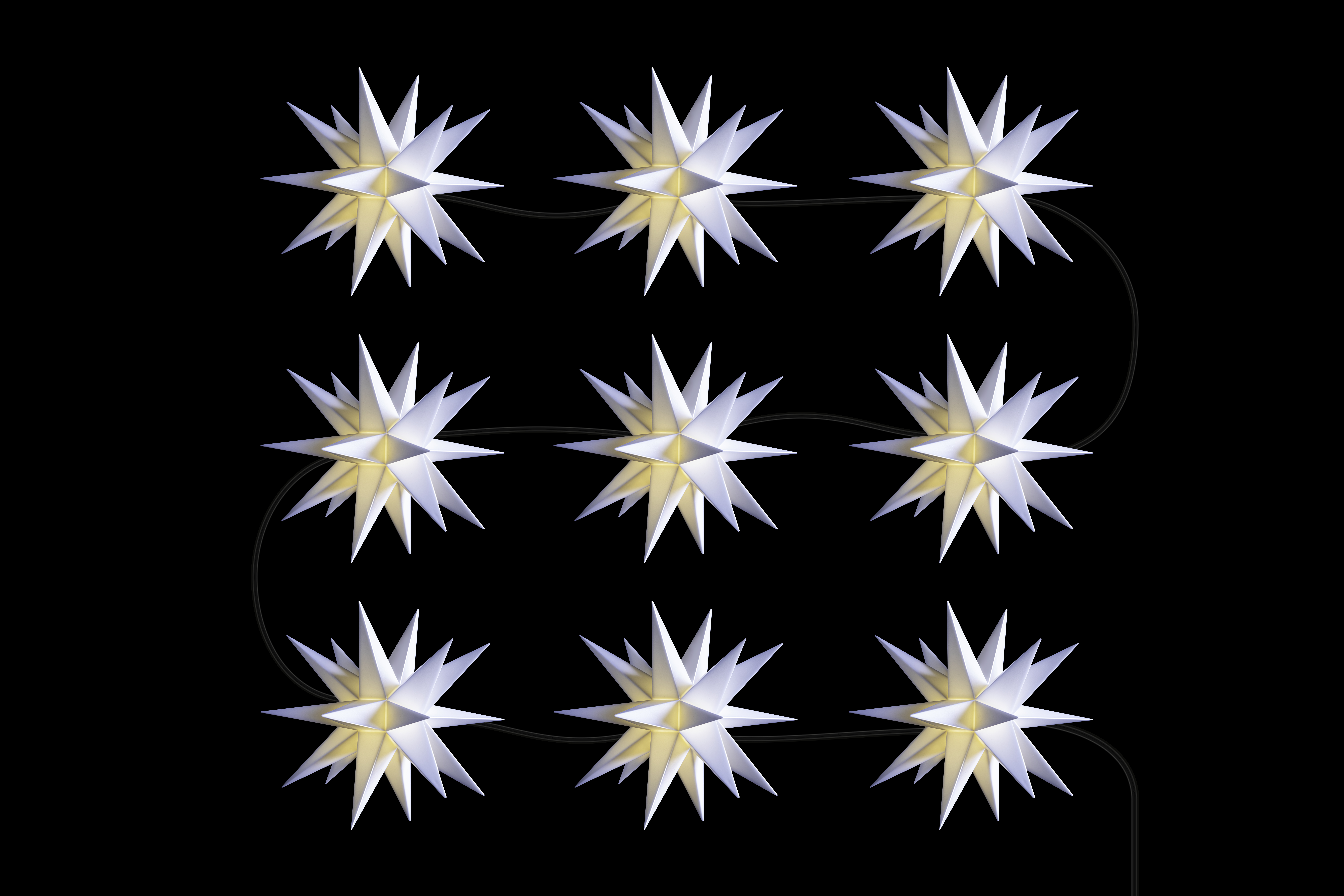 Hinweis: Für Innen- und Außendekoration. Wetterfest, frostresistent und UV-beständig. Lieferung inkl. Außen-Stromkabel mit Außen-Trafo. Inkl. 9 Befestigungsklammern. Der Abstand zwischen den Sternen beträgt 1m.