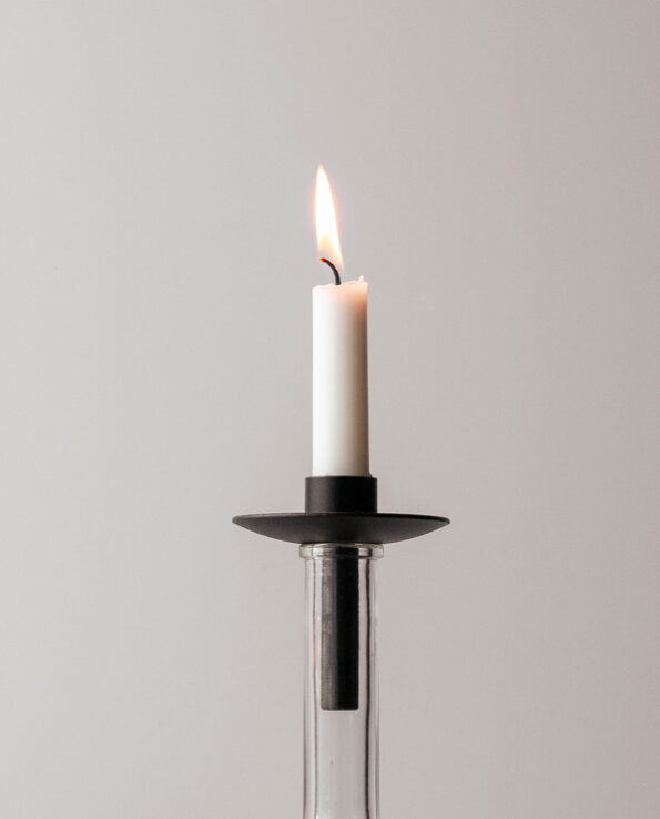 Der massive Kerzenhalter wurde in einer kleinen Schmiede in Småland in Schweden hergestellt. Er kann mit Stabkerzen Ø2,3 cm bestückt werden und passt auf handelsübliche Flaschen.