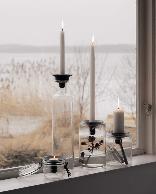 Der massive Kerzenhalter wurde in einer kleinen Schmiede in Småland in Schweden hergestellt. Er lässt sich auf Gläser, Tassen, Vasen oder andere Behältnisse mit einer größeren Öffnung aufsetzen und kann mit Stabkerzen Ø2,3 cm oder mit handelsüblichen Teelichtern bestückt werden.
