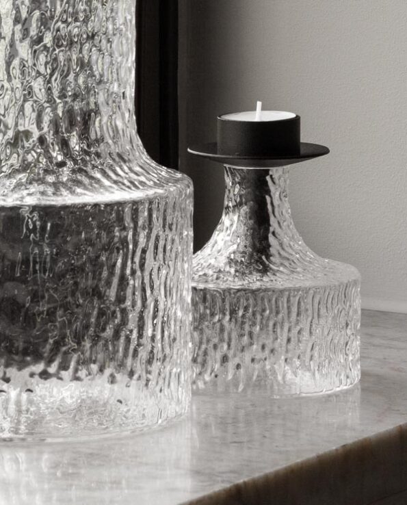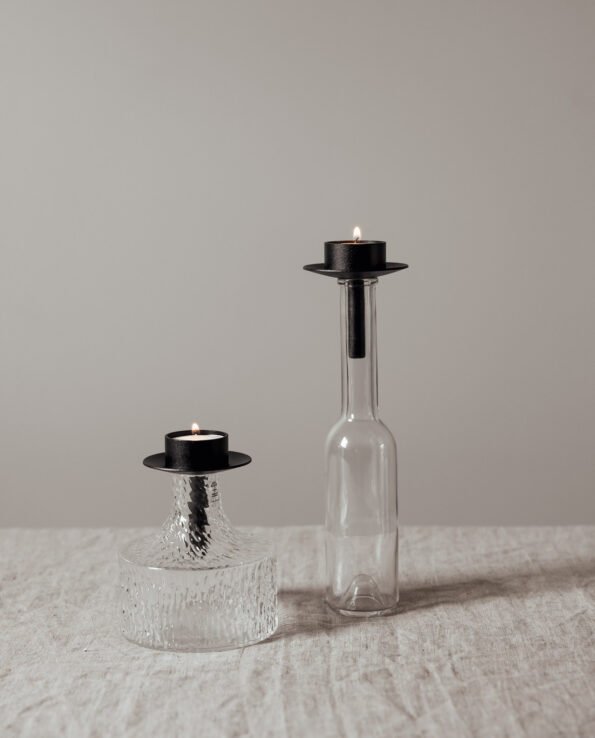 Der massive Kerzenhalter wurde in einer kleinen Schmiede in Småland in Schweden hergestellt. Er kann mit Teelichtern bestückt werden und passt auf handelsübliche Flaschen.